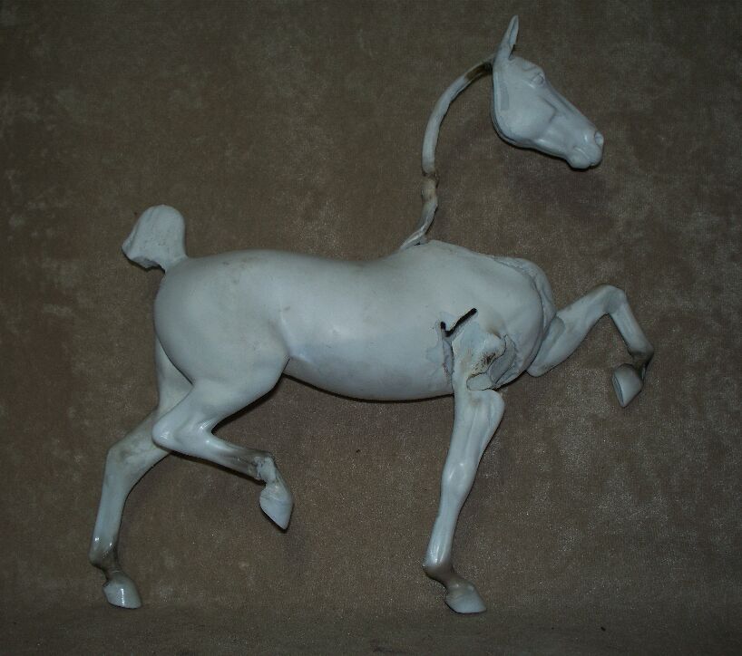 Well, I changed the Peter Stone ASB into a Hackney. So far. This is one of the references I'm going by for the pose except I want his head up higher, but i'll see how it looks once I fill in more sculpting. I may tuck his head some but I don't know. He's going to have his mane braided, but his tail will be cut in a bob though. I've got to replace all the shoulder muscles and do a lot of body work yet.